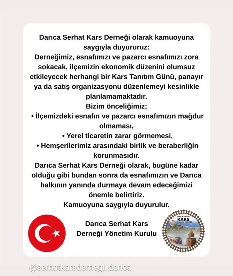 Darıca Serhat Kars Derneği, son günlerde kamuoyunda tartışmalara neden olan “tanıtım günleri” iddialarına ilişkin yazılı bir açıklama yaparak, ilçede esnafı ve pazarcı esnafını mağdur edecek herhangi bir organizasyon planlarının bulunmadığını net bir dille ifade etti.